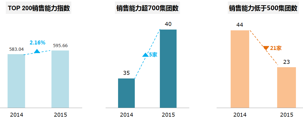 从销售能力维度来看,TOP200销售能力指数达到595.66,比2014年提升2.16%