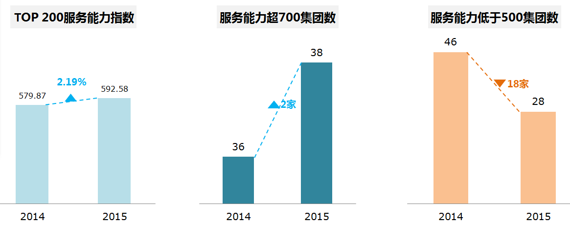 从服务能力维度来看,eTOP200服务能力指数达到592.58,比2014年度提升2.19%