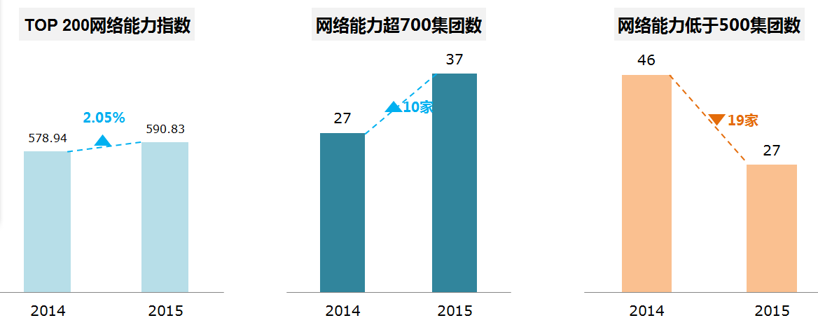 从网络能力维度来看,TOP200网络能力指数达到590.83,比2014年度提升2.05%