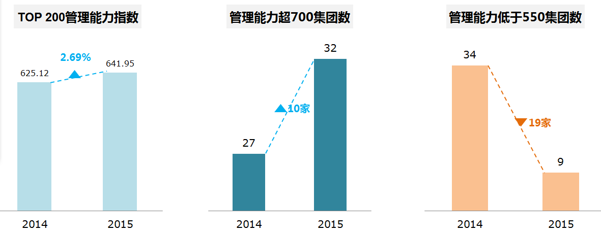 从管理能力维度来看,TOP200管理能力指数达到641.95,比2014年提升幅度达到2.69%