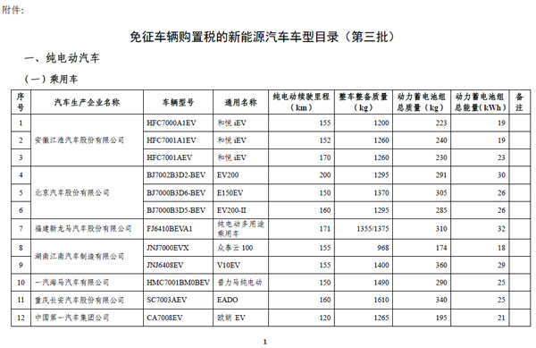 2014年12月19日,工信部、国家税务总局联合发布第三批《免征车辆购置税的新能源汽车车型目录》(2014年第81号),公告称,为促进我国交通能源战略转型、推进生态文明建设、支持新能源汽车产业发展,根据《财政部 国家税务总局 工业和信息化部关于免征新能源汽车车辆购置税的公告》(公告2014年第53号)的要求,工业和信息化部会同国家税务总局等部门对企业提交的申请材料进行了审查。现将《免征车辆购置税的新能源汽车车型目录》(第三批)予以公告。 【点击详情】