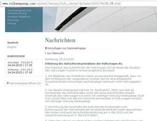 大众集团首席执行官马丁·文德恩 与监事会主席费迪南德·皮耶希的权力之争又有了新进展。在文德恩获得监事会力挺而免于下台后,皮耶希在当地时间周六意外辞职。 大众集团在官方声明中称,执掌大众集团超过20年之久的皮耶希除了辞去主席一职,也不再担任监事会成员及大众集团内部任何职位,此决定即时生效。据悉,监事会副主席胡贝尔(Berthold Huber)将暂时接管监事会,直至新主席选举产生,同时皮耶希的妻子乌 【点击详情】