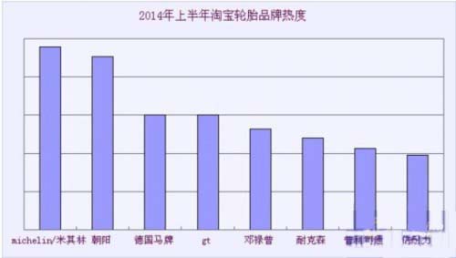 6-8月份是传统的电商促销季,各电商都顺势加入战局。借着年中大促的机会,各大电商打着“价格战”的噱头,带动消费者关注度,拉动消费力和消费欲。各大电商线上运营冲劲十足。根据数据显示,2014年上半年度,各轮胎品牌的销售量比去年均有所攀升,轮胎电商整体运营业绩处于中上水平。 一、轮胎电商产品分析 1、最畅销品牌 2014年上半年,“米其林”荣登上半年度轮胎畅销榜冠军宝座,中国知名轮胎品牌“朝阳”和另一著名轮胎品牌“德国马牌”亦凭借不俗销量紧随其后,位居二、三。