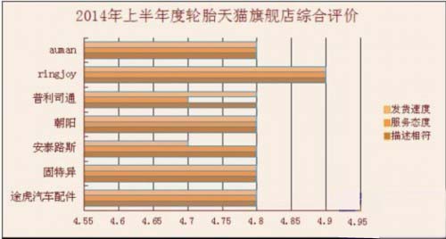 二、店铺分析 1、轮胎天猫旗舰店信用等级评分 据媒体对电商研究中心统计,目前进驻天猫旗舰店的轮胎品牌共有9家。从现有数据来看,无论是产品描述相符程度,还是商家发货速度和服务态度,各家轮胎品牌旗舰店的分数均维持在中等水平。此外,从消费者的打分和评价方面可以看出,目前商家的描述相符和服务态度的满意度普遍较低,提醒商家仍需在这两方面多下功夫。