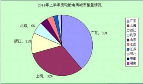 2、轮胎电商地域分布 2014年上半年轮胎电商地域格局继续趋向多样化,上海、广东两个经济发达地区在电商地域分布中共占全国超过七成份额。曾居于电商领域“霸主”地位的一线城市北京,整个上半年销量以微弱差距落后于浙江。江西、山东发展迅猛,试图在轮胎电商市场“分多一杯羹”,由此可见未来轮胎电商的的区域竞争势必更加激烈。