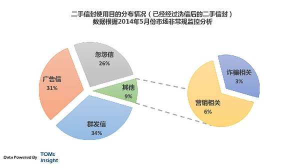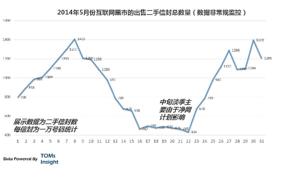 每天,中国互联网黑市上的信封号出售的数量都大概在1000万个左右,TOMsInsight通过一些非常规手段监控2014年5月份一个月内黑市的出售二手信封总数量可以见下图,我们能监控到的样本只占少数所以通过一些算法预估和去重,数据并不非常精确:
