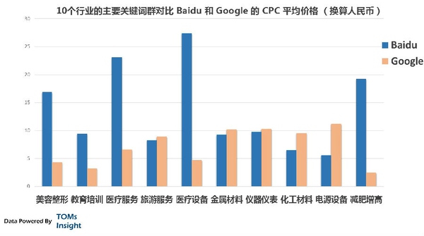 外行看热闹,内行看门道,中国互联网圈子比较浮躁,而发出各种声音的外行又较多。又所谓三人成虎,大家说多了,好像默认的也就是这样了,这导致了有很多约定俗成的被人广泛认同的观点。例如百度在移动端落伍了,百度是一个技术公司,百度是一个媒体公司等等。而事实真的是这样么? 百度一直饱受争议,但是很少有人深入下去了解百度与他的中小广告主客户们构建的生态环境。大家总是拿百度和Google相比,看的是如果击败Google,如何和360PK等等,但是这些都是表象。如果不去深入的看到这些公司的盈利和生态环境,仅仅在表面大谈特谈战略和未来又有什么意思呢? 下图我们选取了互联网广告的热门的10个行业,通过技术手段对比了特定时间段内Baidu和Google的CPC价格(CPC是指Cost Per Click,广告投放后按照每一次点击付费,是Baidu和Google的主要广告售卖方式)