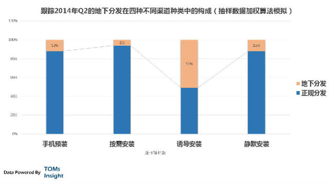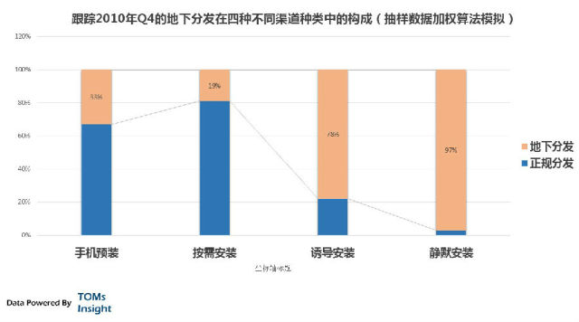 几乎全部的静默安装渠道和一部分诱导安装都可以算是地下分发渠道,由于2010年Q4时监管问题,手机预装和按需安装也会有一部分。