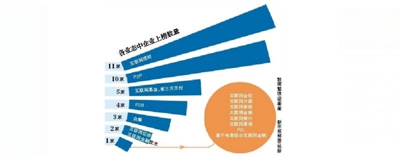此次榜单中50家企业涉及中国互联网银行、互联网票据、互联网保险、互联网证券、互联网理财、互联网基金、互联网分期、第三方支付、P2P、P2B、P2L、众筹、大数据金融等16种互联网金融企业。