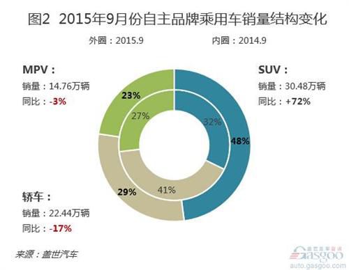 同时,伴随着各类产品销售的表现不同,自主品牌产品结构也因此发生重大改变。在自主品牌三大乘用车类型中,今年9月份SUV产品销售占比已达48%,接近一半;而轿车、MPV销售占比分别降至29%和23%。