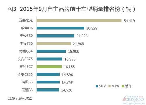 哈弗、宝骏和吉利品牌分别以5.21万辆、4.81万辆和4.58万辆销量依次排名第三至第五位,销量同比快速增长,其中以宝骏增长最强劲,增幅高达93.0%,新车宝骏730、560是其销量增长的主要推动力量。而去年同期排名第三的奇瑞,今年9月份销量下跌21.9%至3.41万辆,排名降至第七。