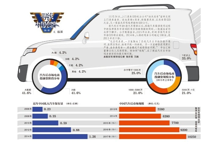 巨大的“蛋糕”令分食者垂涎三尺。公开数据显示,2015年以来,有40多家汽车后市场O2O项目涌现。2014年,入场的创业公司超过100家,是2011年的近十倍。他们涉及洗车、维修保养,汽车租赁、汽车金融保险等后市场各细分领域。
