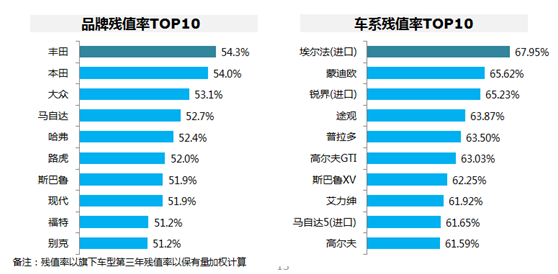 品牌残值率TOP10中,合资品牌占据9位,丰田第一,本田第二,大众第三,而哈弗是唯一自主品牌。