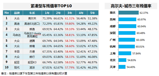 紧凑型车残值率TOP10,大众占据5席;高尔夫排名第一,其城市残值率重庆居首。