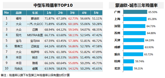 中大型车残值率TOP10,德系4席;蒙迪欧排名第一,其各城市残值率广州居首。