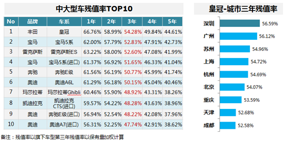 中大型车残值率TOP10,德系占据6席;皇冠排名第一,其各城市残值率深圳居首。