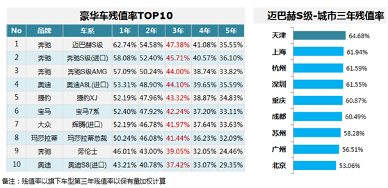 豪华车残值率TOP10,德系占据8席;迈巴赫S级排名第一,其城市残值率天津居首。
