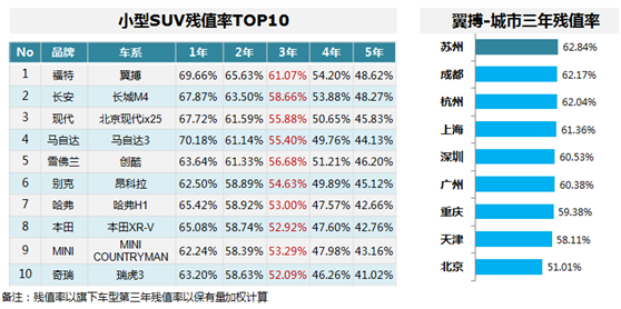 小型SUV残值率TOP10,自主、美系各占3席;翼搏排名第一,其城市残值率苏州居首。