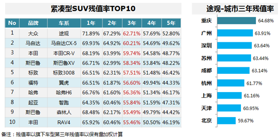 紧凑型SUV残值率TOP10,日系占4席;途观排名第一,重庆残值率占首。