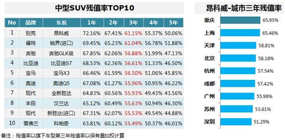 中型SUV残值率TOP10,德系、美系各占3席;昂科威排名第一,重庆残值率占首。