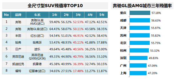 全尺寸型SUV残值率TOP10,奔驰GL级占2席;奔驰GL级AMG排名第一,重庆残值率占首。