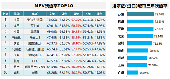 MPV残值率TOP10,日系占4席;埃尔法(进口)排名第一,其城市残值率苏州居首。