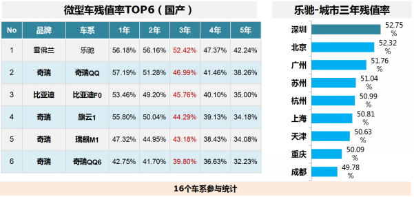 微型车残值率TOP10中,奇瑞占据5席;乐驰排名第一,其各城市残值率,深圳居首。
