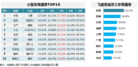 小型车残值率TOP10,日系占优;飞度排名第一,其各城市中深圳居首。
