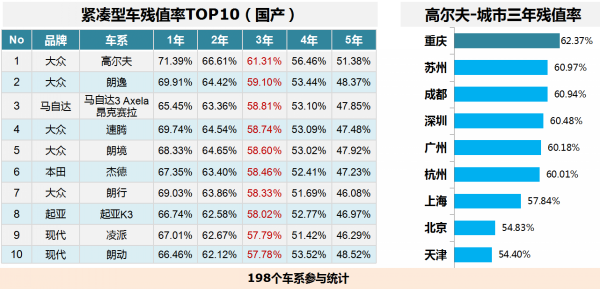 紧凑型车残值率TOP10,大众占据5席;高尔夫排名第一,城市残值率重庆居首。