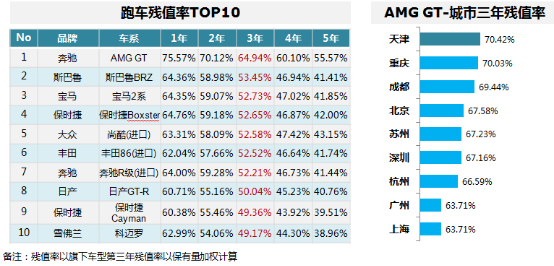 跑车残值率TOP10,德系占据5席; AMG GT级排名第一,其城市残值率天津居首。