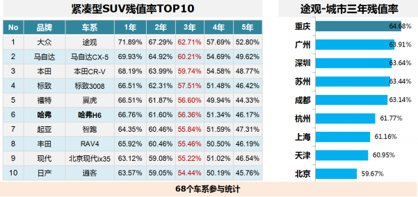 中型SUV残值率TOP10,德系、美系各占3席;昂科威排名第一,重庆残值率占首。