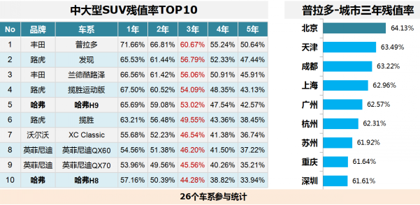 中大型SUV残值率TOP10,丰田占4席;普拉多排名第一,北京残值率占首。