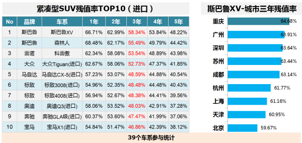 紧凑型SUV残值率前十名中,日系车占4席。斯巴鲁XV排名第一,其残值率城市排行榜中,重庆居首。