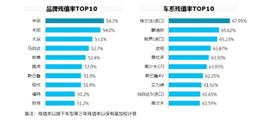 从数据来看,2015年汽车品牌残值率前十名之中自主品牌仅有哈弗一家,残值率为52.4%;其他都被合资品牌所包揽,其中丰田以54.3高居榜首,本田和大众紧随其后。