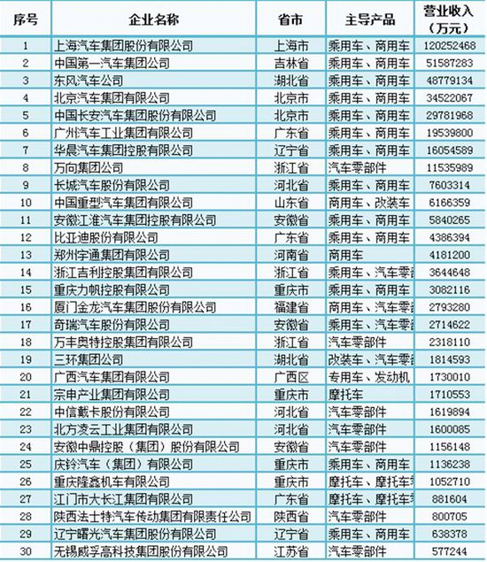 榜单中,乘用车公司16家,商用车公司4家,零部件公司7家,摩托车公司3家。本次榜单基于“年度汇总口径快报”统计2015年营业收入,和上市公司合并财务报表中的营业收入存在计算上的差别,后者抵消了关联交易部分。这也是为何上汽2015年年报中营收为670,448,223,139.34元,而本榜单中为1.2万亿元的缘故。