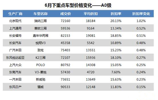 从车型细分来看,A0级市场战火非常猛烈,降幅最高的是北京现代瑞纳三厢车型。从经销商得到的数据来看,该车6月平均成交价为72,160元,折扣率环比上升1.02%,平均折扣为18,184元;折扣率高达20%。而上汽通用的赛欧让利幅度也很明显,数据显示赛欧三厢6月平均成交价为59,536元,折扣率环比上升0.52%,平均折扣为9,164元;出现这样的情况也是由于上汽通用提高了该车的销售目标奖励导致经销商放价。