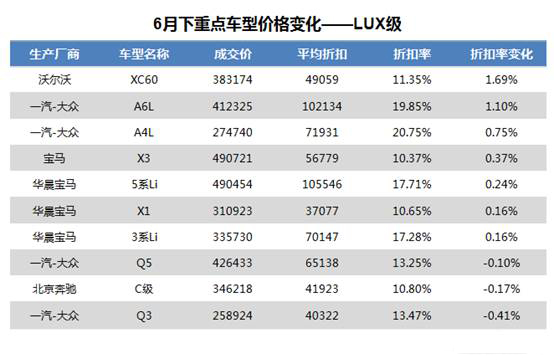 而在豪华汽车品牌当中,沃尔沃XC60 折扣最高,平均让利达到了49,059元,折扣率环比上升1.69&,平均成交价为383,174元;而奥迪A4L由于换代在即,平均成交价仅为27万元左右,部分1.8T车型已经跌破20万大关直接威胁到帕萨特市场,平均让利幅度高达7万元左右。而作为奥迪热销的Q3和Q5车型,由于旧款下市6月相比5月折扣率分别下降0.41%和0.1%,6月平均成交价分别为258,924和426,433元,平均折扣为40,322元和65,138元。
