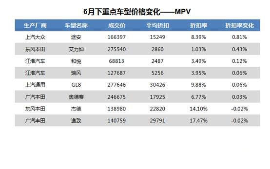 合资品牌方面,整体折扣率环比变化也不大。上汽大众途安新车效应逐渐消退,促销优惠加大,6月平均成交价为166,397元,折扣率环比上升0.81%,平均折扣为15,249元;东风本田艾力绅2015年旧款已停销,2016年年款少量优惠,6月平均成交价为275,540元,折扣率环比上升0.43%,平均折扣为2,860元。