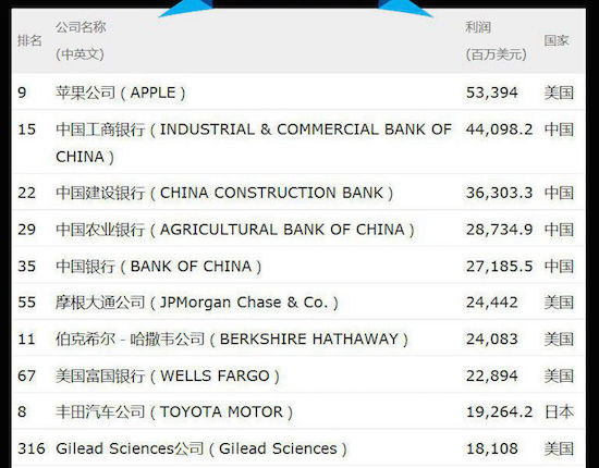 具体到中国企业,110家上榜企业中的前十榜单,基本被银行、石油和保险企业瓜分,其中银行保险企业数量占到“半壁江山”。而在世界500强企业最赚钱的前十排名中,除去位列第一的美国苹果公司,2~5位均是来自中国的银行企业。行业利润占比达28.26%的银行商业储蓄业,仍是所有行业中最赚钱的行业。