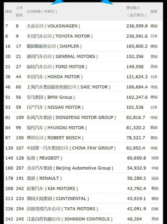 中国入围的6家整车企业中,除了一汽集团较上一年度营业收入排位从107名掉到130名,其余5家车企排名均有不同程度提升。其中浙江吉利控股集团作为入榜的唯一一家中国民营企业,以67位的最大排名提升幅度,从477名来到410名。广汽集团则依靠去年传祺GS系列产品的热销,提升59位来到榜单303的位置。此外,上汽集团凭借其两大合资公司上汽大众和上汽通用的利润贡献,稳居6家中国车企榜首,在500强企业排行榜上也继续提升14个名次,来到第46名。东风集团则以28个位次的提升,排在榜单第81名,位居六家中国车企“榜眼”位置。