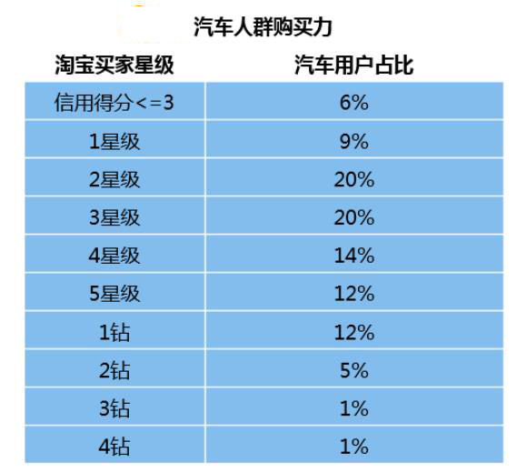 值得注意的是在本次报告中,UC汽车大数据打通了同为阿里旗下的淘宝数据,报告显示,UC汽车用户在淘宝买家的星级体系中,二星到一钻用户占比为78%,这也证明汽车用户与淘宝主力用户在消费习惯和消费能力处在同一水平线中。