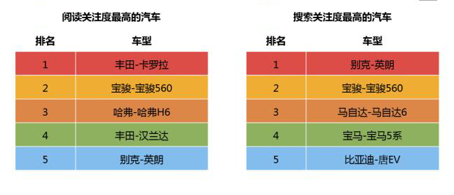 在汽车行业整体火爆的背后,国产车起到了至关重要的推动作用。数据显示,国产车尤其是SUV车型对合资品牌发起了强劲挑战,以大众为代表的合资车型不在拥有绝对的关注优势。报告还显示,阅读关注度最高的五款车型是:卡罗拉、宝骏560、哈弗H6、汉兰达和英朗。从用户主动检索车型的情况来看,别克英朗、宝骏560、马自达6、宝马5系和比亚迪唐EV是被主动检索最多的五个车型。
