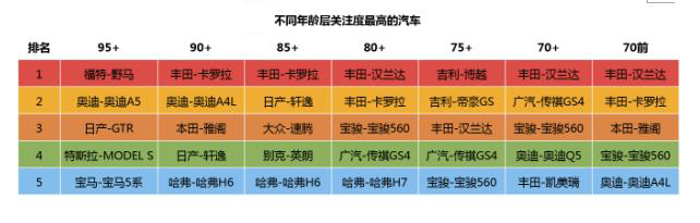从人群年龄层来看,由于已经拥有一辆轿车或存在换代需求,70前到80后用户更多开始关注SUV。而正处在有购车需求的85后和90后则关注于处在自己购买范围能力之内的紧奏型轿车。值得注意的是95后用户,在经济发展稳定,家庭消费能力增强的背景下,他们关注的车型明显具有个性化需求特征。前三位分别是:福特野马、奥迪A5及日产GT-R,这与70、80人群的关注车型截然不同。