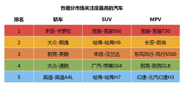 在车型分类排行榜中,轿车中关注度最高的分别是卡罗拉、朗逸、英朗、速腾、奥迪A4L。这样的家用型三厢车与国人的购买力和对汽车的理解非常相符。在火爆的SUV车型上,宝骏560和哈佛H6这样的国产车型力压7座车的代表汉兰达。同时传祺GS4和哈佛H7也同样拥有大批支持者。MPV方面,国产车则完胜合资车,宝骏730、欧尚、风行S500占据前三位,老面孔GL8位居第四,北汽幻速H3紧随其后。