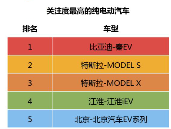 在消费观念及政策上的优势,让纯电动汽车逐渐成为各大车企在未来发展的重点方向。本次报告中,关注度最高的纯电动汽车包括:比亚迪秦EV、MODELS、MODELX、江淮iEV、北汽EV系列。值得注意的是,来自美国的特斯拉不敌国产的比亚迪秦EV。而江淮iEV和北汽EV系列,也对特斯拉的位置虎视眈眈。