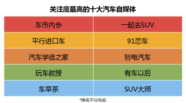 随着汽车产业的发展,汽车自媒体也正处在爆发期,UC作为信息服务平台在调性上提供了快乐阅读的土壤。自媒体在车辆保养、案例分享、内容导读和热点追踪上更加垂直和接地气。而随着UC订阅号的逐步完善,汽车自媒体在内容创造、变现渠道方面将会更加多元化的发展。本次报告中关注度最高的自媒体分别是:车市内参、一起去SUV、平行进口车、91恋车、汽车学徒之家、智电汽车、玩车教授、有车以后、车早茶、SUV大师。