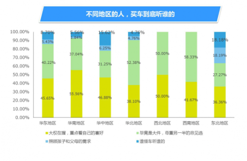 出乎意料,有数据显示,最为顾家的是东北地区,仅有36.36%的市民表示购车唯我独尊,处于各地区数据的最低值。其27.27%的市民表示:毕竟是大事,尊重另一半的选择;还有18.19%的东北人选择照顾孩子、父母需求,18.18%的东北人选择谁懂车听谁的。