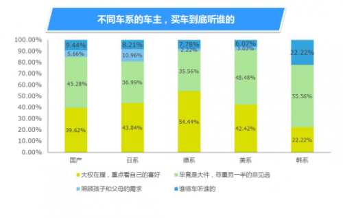 近年迅速兴起的国产车系,国产车车主也更顾家,有45.28%的消费者表示会尊重另一半的意见,占了总数大头。