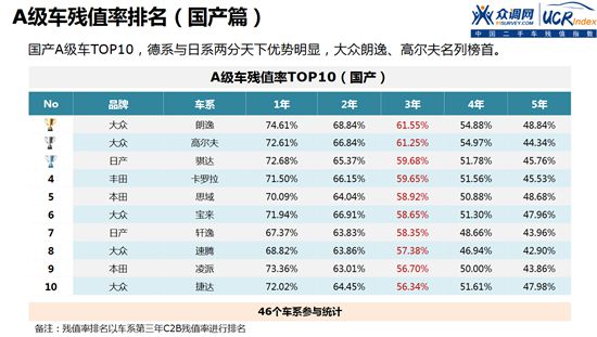 伴随中国汽车市场的持续火热,A级车在乘用车的市场份额占比中依旧处于领先地位。各大厂商对A级车的关注及投入也持续加大。从残值排行榜结果来看,大众品牌优势明显,TOP10中占据5席,对比2015年,日系车的表现趋势较好。