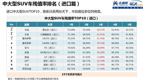 中大型进口SUV残值率排行榜中,丰田系和雷克萨斯霸占前四名。BBA没有位列榜首,据推测主要是使用成本影响保值率;日产途乐2016年异军突起;大众途锐品牌劣势受影响等。